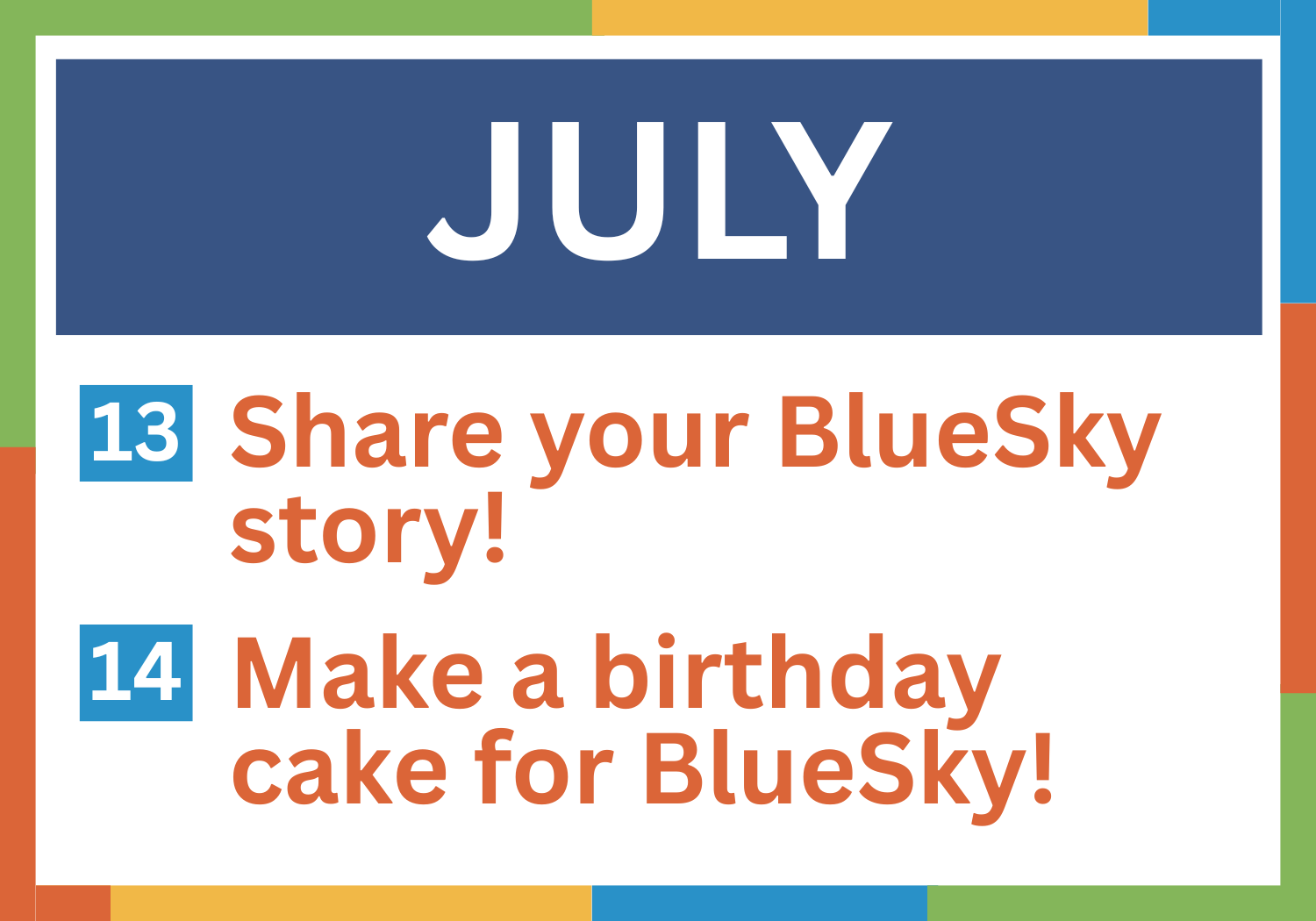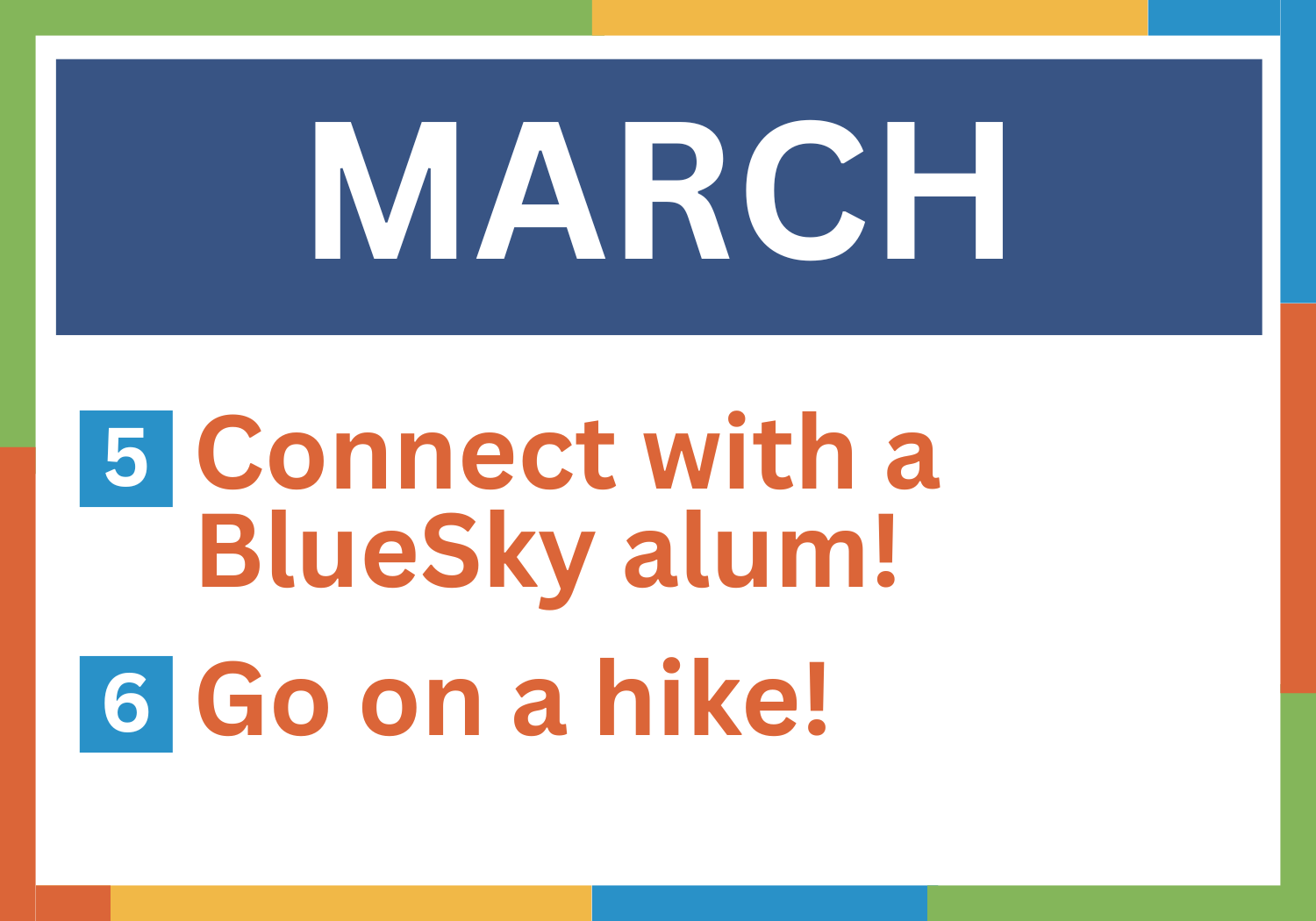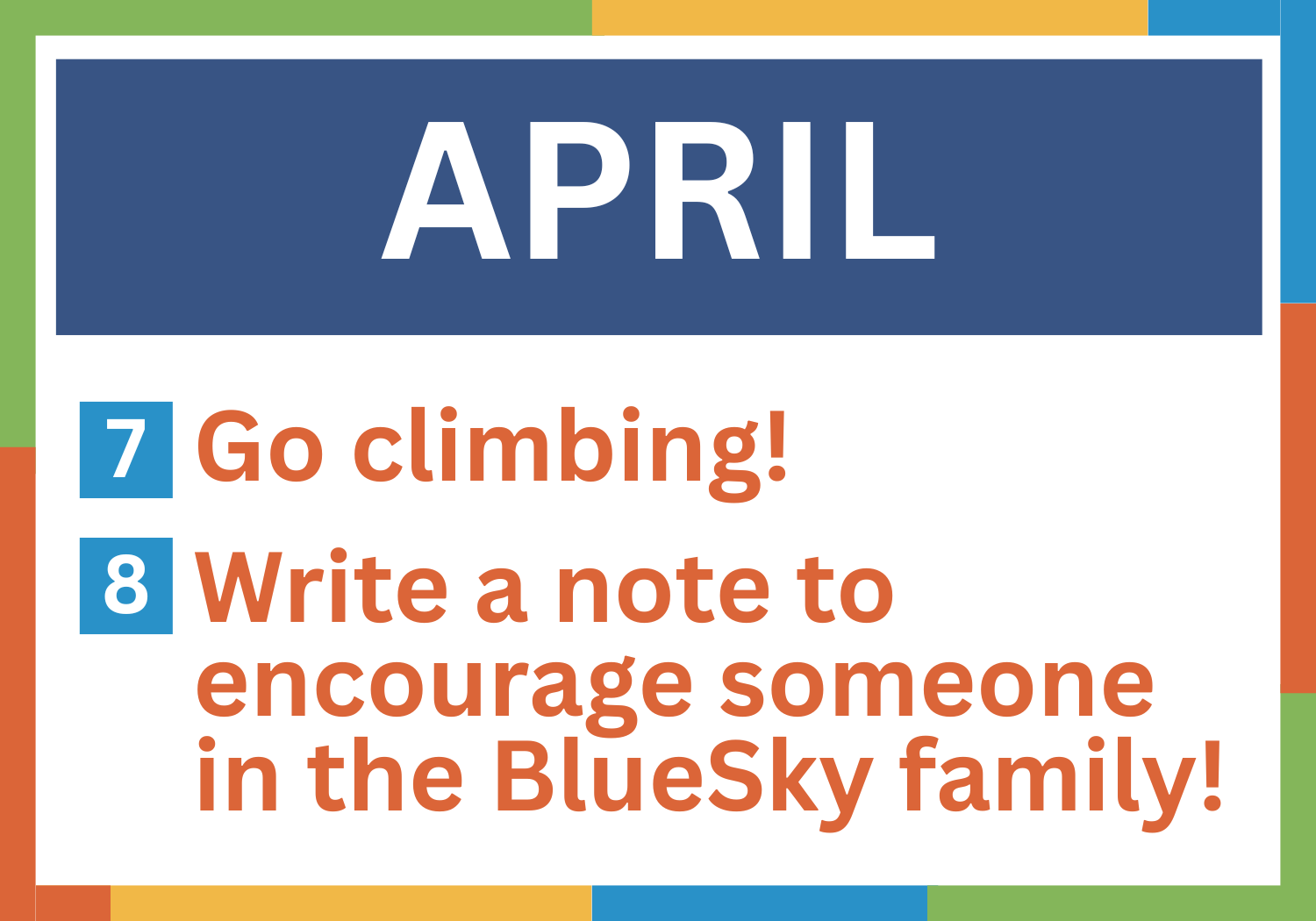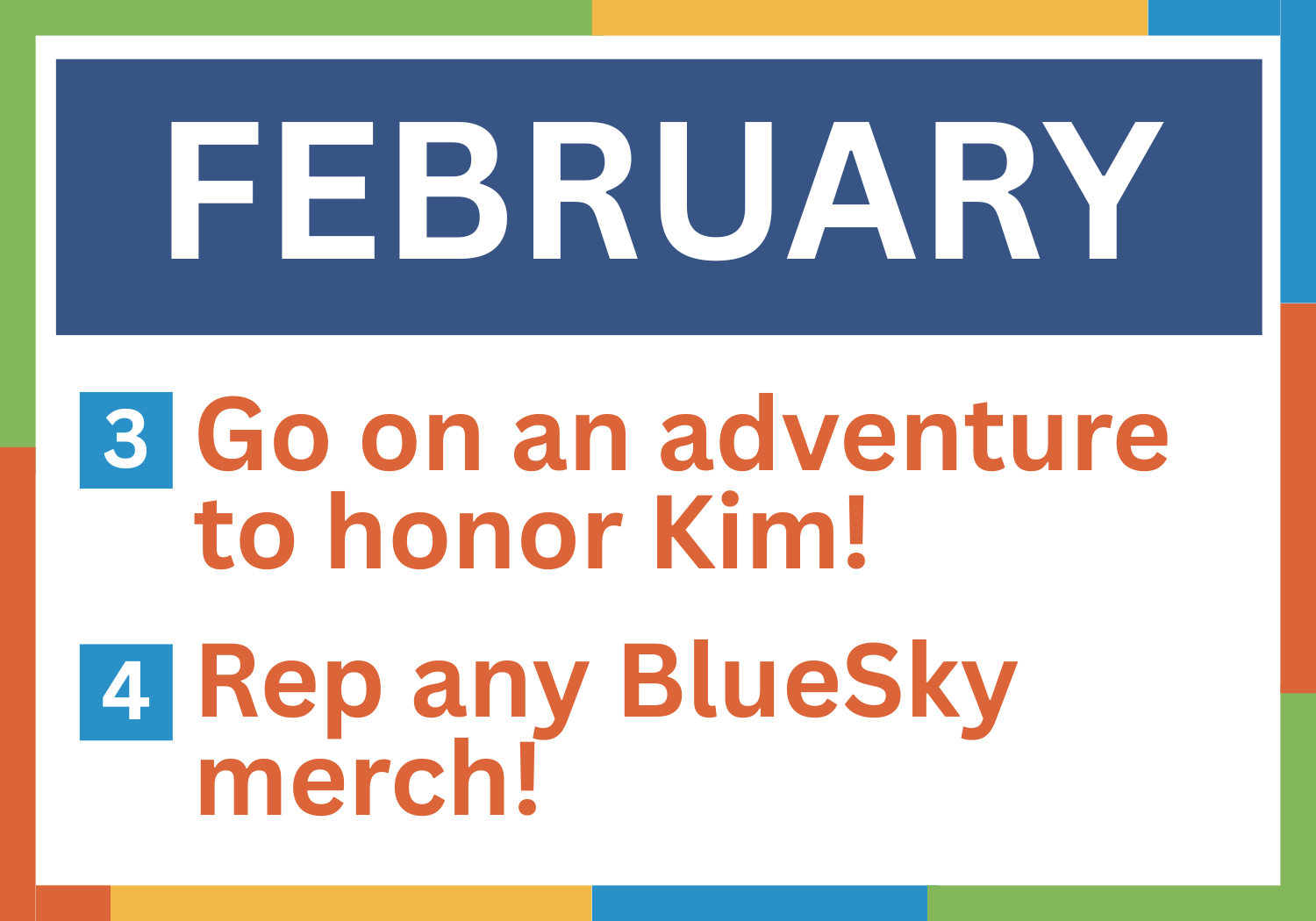 Join us as we take on a new adventure each month! Each month, as a greater BlueSky family, we will have a new adventure to embark on.